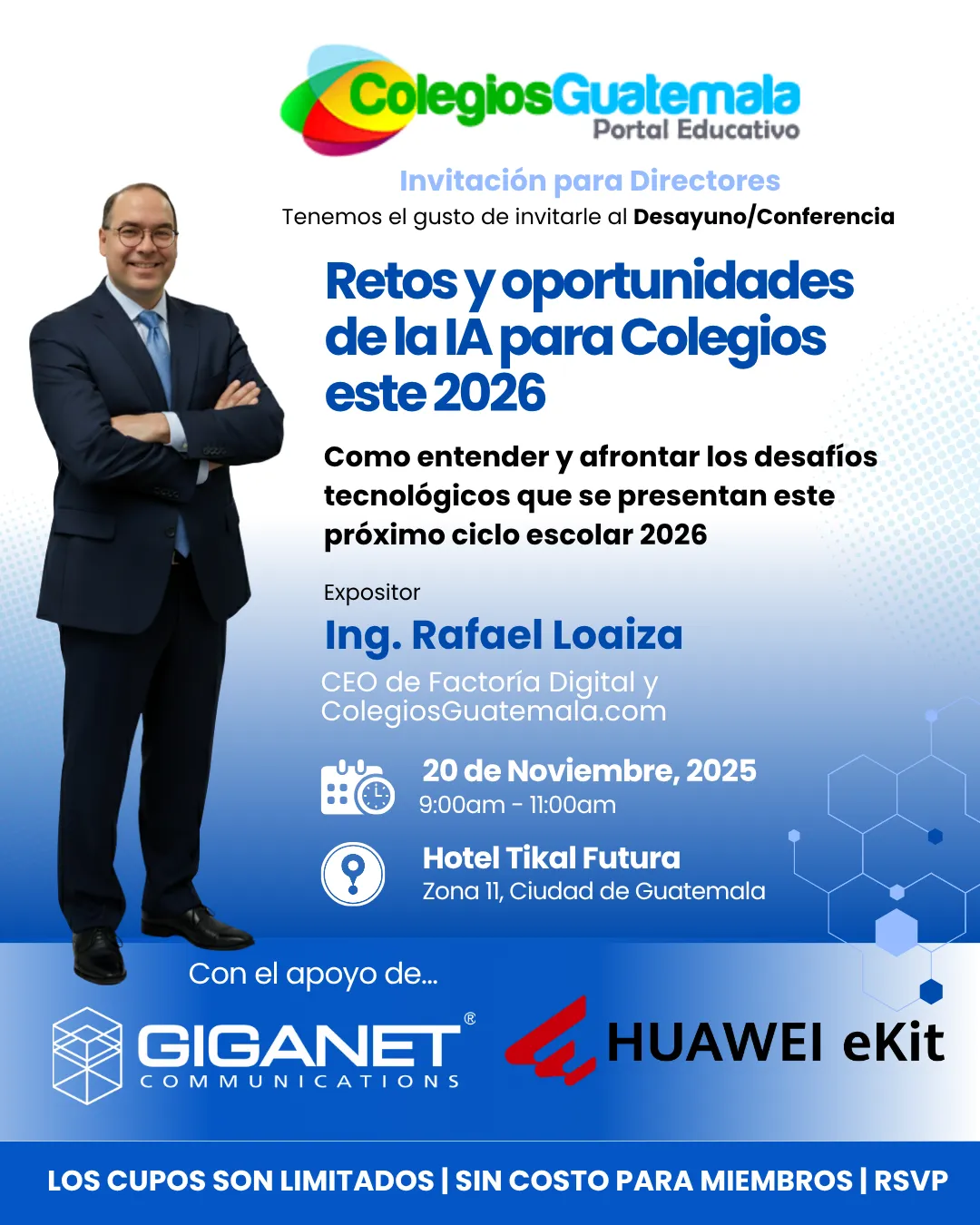 Queremos extenderle una muy cordial invitación al Director de su Colegio o la persona que designe, para que nos puedan acompañar a un Desayuno Conferencia en el Hotel Tikal Futura, el jueves 20 de noviembre de 2025 de 9am a 11am, en el que estaremos compartiendo información sobre los retos de la IA para los Colegios este 2026.
